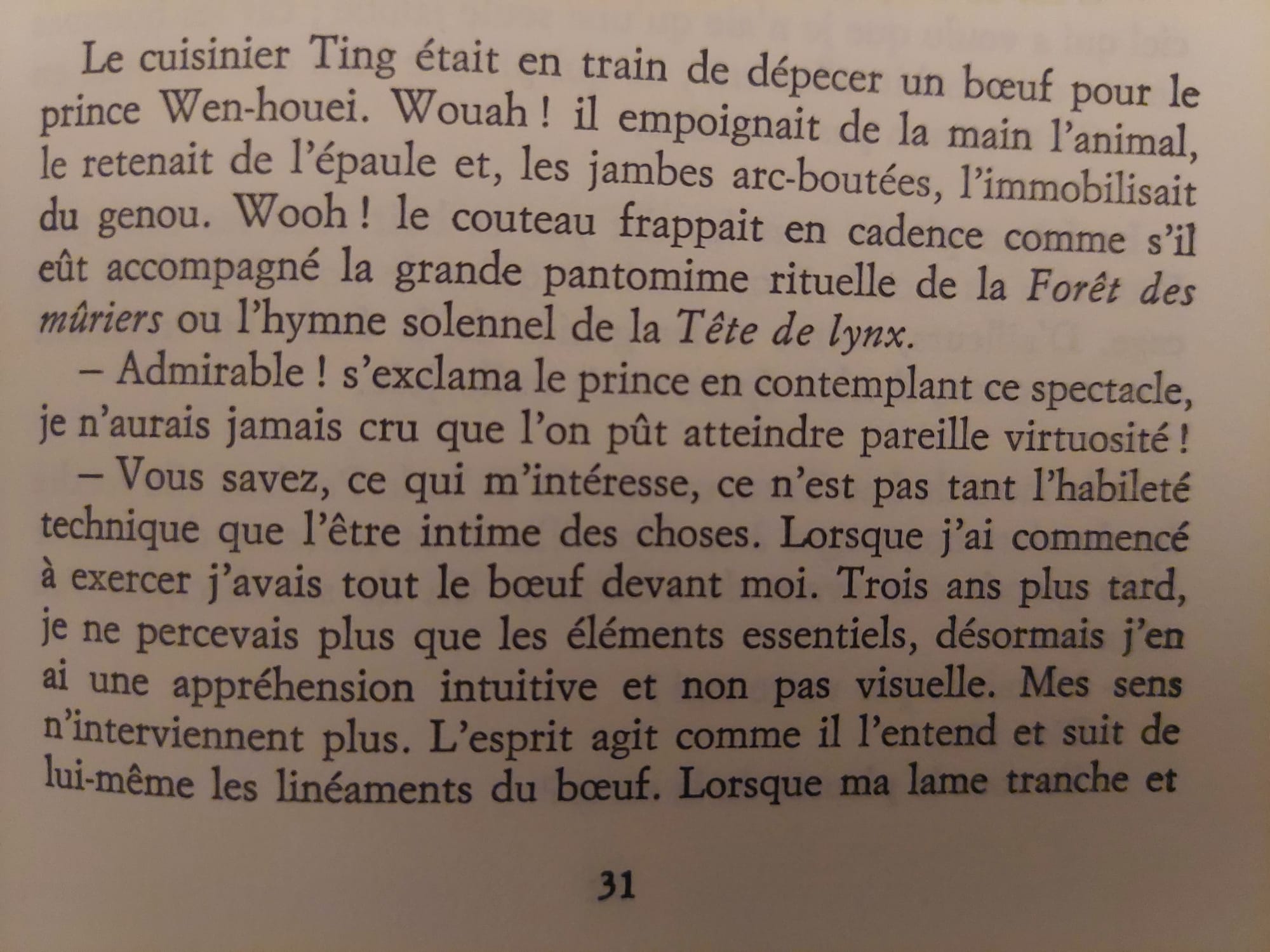 Je lis en ce moment Les Œuvres de Maître Tchouang, en quelque sorte le second texte fondateur du taoïsme après le Tao Te King de Lao Tseu. Étant composé de courtes histoires, il est bien plus narratif, et l'une d'elle me reste dans la tête depuis plusieurs jours : celle du cuisinier Ding.